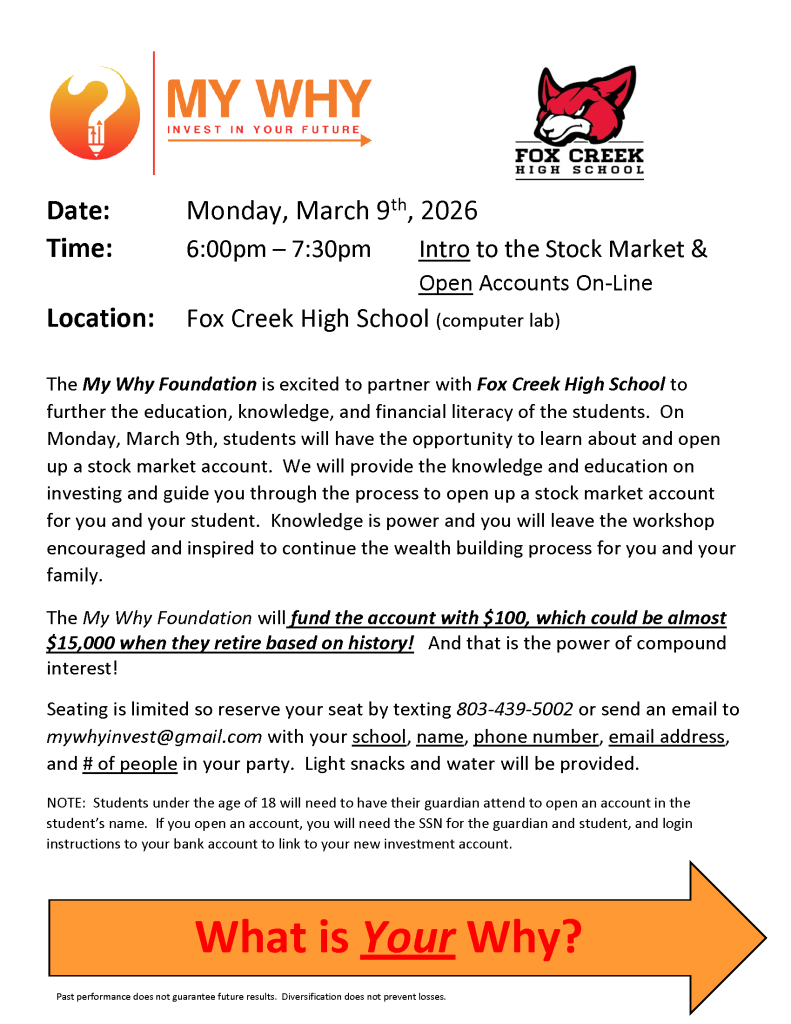 The My Why Foundation is excited to partner with Fox Creek High School to further the education, knowledge, and financial literacy of the students on March 9th, 2026!